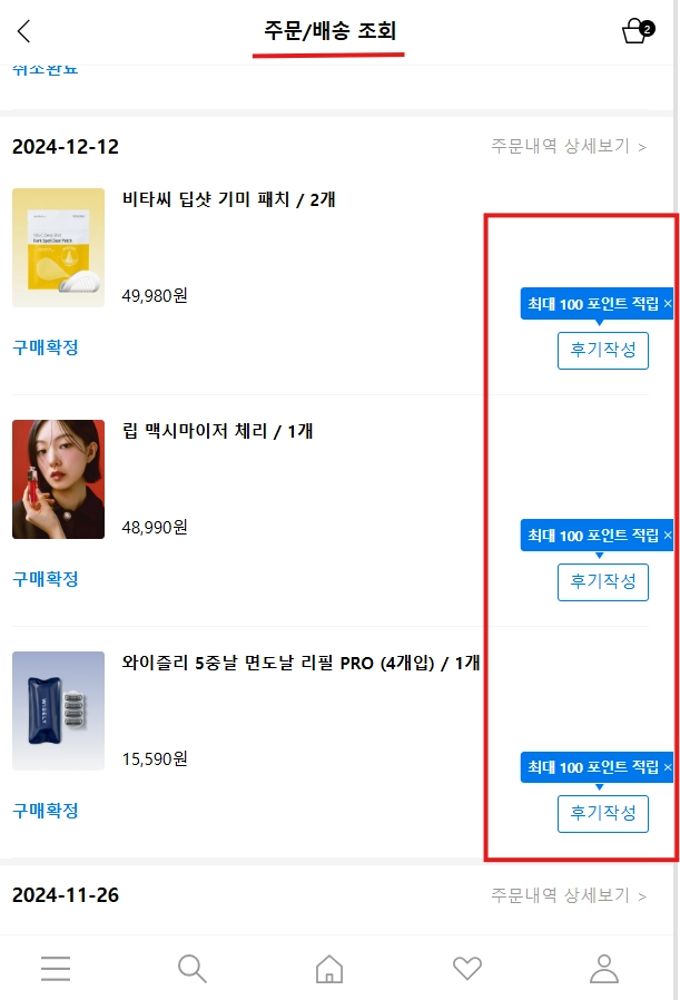포인트 작성은 배송이 완료된 상태에서만 후기를 작성하실 수 있습니다