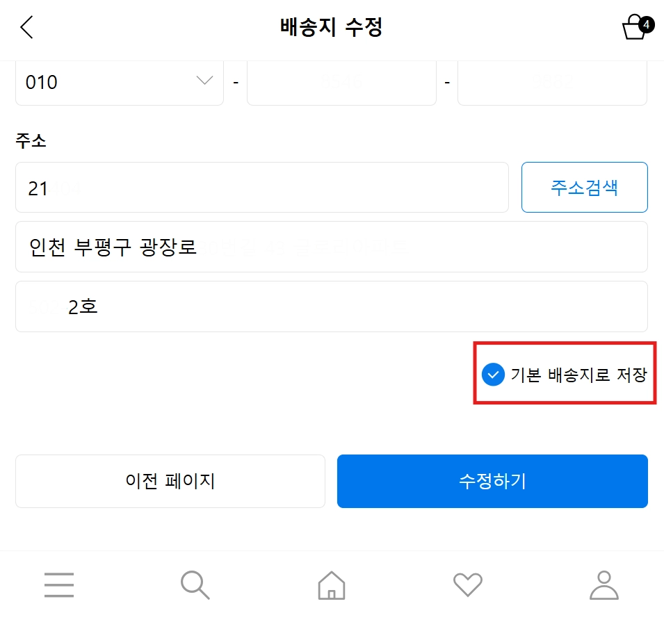 ✓ 배송지 수정 > 기본 배송지로 저장 체크박스 표시 후 수정하기